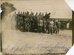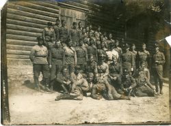 Czarno-biała fotografia przedstawiająca grupę żołnierzy w mundurach letnich przed drewnianym budynkiem. Na odwrocie odręczne adnotacje: 2-gi p. st. Konnych Hrubieszów 1922. por. Niemierowicz. Fotografia z pewnością późniejsza niż rok 1922, tak jednolite umundurowanie nie by...więcej Czarno-biała fotografia przedstawiająca grupę żołnierzy w mundurach letnich przed drewnianym budynkiem. Na odwrocie odręczne adnotacje: 2-gi p. st. Konnych Hrubieszów 1922. por. Niemierowicz. Fotografia z pewnością późniejsza niż rok 1922, tak jednolite umundurowanie nie bylo jeszcze wtedy spotykane, poza tym większość żołnierzy ma na głowach furażerki wz. 23. |