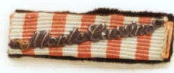 Baretka z tkaniny od Krzyża Pamiątkowego Monte Cassino. Na niej metalowy napis :Monte Cassino. |