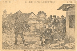 Pocztówka w kolorach czarno-białym z odcieniami szarości. Pocztówka wydana z okazji 25-lecia czynu legionowego. U dołu widnieje napis "Pierwsze boje Legionów". |