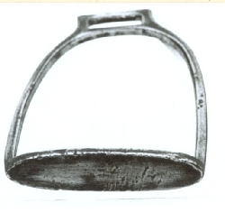 Strzemię mosiężne. Podstawka pod stopę pełna, płaska. Kabłąk wydłużony z płaskim, prostokątnym otworem u góry.Powierzchnia poczerniała, pokryta miejscami zielonkawym nalotem. |