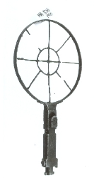Celownik p.lot do CKM. Okrąg o średnicy 116 mm, z 8 promieniami. Celownik osadzany jest na stalowym uchwycie. Na uchwycie wytłoczone "G2" w otoku, nad nim kolejne tłocznie w otoku, nieczytelne. Całość celownika skorodowana, ubytki metalu na promieniach. |