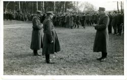 Fotografia w tonacji czarno-białej. NA pierwszym planie trzej żołnierze (prawdopodobnie oficerowie- ppor.). W tle duża grupa mężczyzn- cywili i chłopców. Prawdopodobnie jest to uroczystość upamiętniająca poległych partyzantów (być może uroczystość towarzysząca ekshum...więcej Fotografia w tonacji czarno-białej. NA pierwszym planie trzej żołnierze (prawdopodobnie oficerowie- ppor.). W tle duża grupa mężczyzn- cywili i chłopców. Prawdopodobnie jest to uroczystość upamiętniająca poległych partyzantów (być może uroczystość towarzysząca ekshumacji poległych partyzantów do mogiły w Krynicach). Na odwrocie adnotacja: "Krynice 1947-1946" |