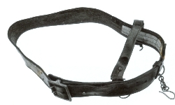 Pas główny oficerski. Wykonany ze skóry brązowej, blankowanej. Klamra mosiężna, z dwoma bolcami. W górnej części wszyte strzemiączko, w dolnej trzy (do szelki naramiennej i broni bocznej). Przy górnym strzemiączku część szelki naramiennej. Szyty ozdobnie, brak symboli. P...więcej Pas główny oficerski. Wykonany ze skóry brązowej, blankowanej. Klamra mosiężna, z dwoma bolcami. W górnej części wszyte strzemiączko, w dolnej trzy (do szelki naramiennej i broni bocznej). Przy górnym strzemiączku część szelki naramiennej. Szyty ozdobnie, brak symboli. Przy dolnym strzemiączku mosiężny łańcuszek z sześciu ogniwami, zakończony haczykiem. |