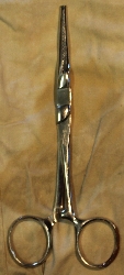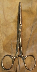 Kleszczyki typu Pean, służące do zaciskania krwawiącego naczynia. Zakończenia gładkie. Rękojeść