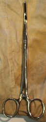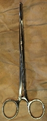 Na jednym z ramion wizerunek węża owiniętego wokół laski zakończonej gałk...więcej Kleszczyki typu kocher, z rękojeścią nożyczkową i z blokadą otwarcia. Część robocza zakrzywiona, poprzecznie kanelowana z ząbkiem na końcu.