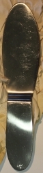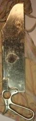 Szpatuła brzuszna typu reverdin ( od nazwiska szwajcarskiego chirurga), innaczej stopniowany hak kształtem zbliżony do płaskiej łyżki. Służy do odsuwania i podtrzymywania narządów w jamie brzusznej w czasie operacji. Sygnatury: na węższym końcu w rombie litera H, znak przy...więcej Szpatuła brzuszna typu reverdin ( od nazwiska szwajcarskiego chirurga), innaczej stopniowany hak kształtem zbliżony do płaskiej łyżki. Służy do odsuwania i podtrzymywania narządów w jamie brzusznej w czasie operacji. Sygnatury: na węższym końcu w rombie litera H, znak przypominający literę Ł( w rosyjskim alfabecie) , 38 IX. |