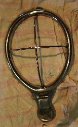 Maska wykonana ze stali chromowanej , owalna, z niewielką rękojeścią i trzema przynitowanymi kabłąkami ze stalowego drutu.