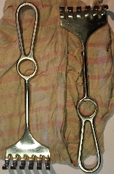 Część robocza krótka, poprzecznie kanelowana. Sygnatury : na jednym z ramion (poniżej łączenia wybite: 43, niżej na tym samym ramieniu : L.ISENBERG, KRAKÓW, dalej wąż owinięty wokół laski zakończonej gałką, zwieńczoną koroną, nad tym półkolisty napis: AESCULAP. Na jednym z ramion nitka lniana. Część narzędzia, w trakcie pracy przylegająca do dłoni gęsto, podłużnie żłobkowa. |
