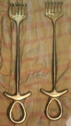 Hak chirurgiczny służący do rozwierania naciętych tkanek w celu uwidocznienia pola operacyjnego. Część robocza składa się z sześciu masywnych ?pazurów?, tępo zakończonych. Rękojeść ażurowa z dwoma otworami ? okrągłym i kroplowatym. Sygnatury: