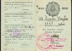 Legitymacja nr. 621 uprawniająca do noszenia Odznaki Strzeleckiej wystawiona na nazwisko ppłk Muzyka Władysław S.P.R.P. Zambrów. W lewym dolnym rogu okrągła pieczęć z orłem w koronie i napisem : Związek Strzelecki nr 1 Komenda Okręgu. Obok pieczęć podłużna: Komendant Ok...więcej Legitymacja nr. 621 uprawniająca do noszenia Odznaki Strzeleckiej wystawiona na nazwisko ppłk Muzyka Władysław S.P.R.P. Zambrów. W lewym dolnym rogu okrągła pieczęć z orłem w koronie i napisem : Związek Strzelecki nr 1 Komenda Okręgu. Obok pieczęć podłużna: Komendant Okręgu nr 1 Związku Strzeleckiego, mjr R. Kłosiński Okręgowy Z.S, podpis nieczytelny. Wewnątrz legitymacji wpisy datowane od 22.VI.32 r. do 30.IX.34 r., obok trzy pieczęcie Związku Strzeleckiego. Na ostatniej stronie wpis nadania Odznaki Strzeleckiej klasy I (1.11.1934 r.). |