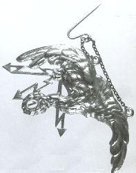 Odznaka nawigatora wojskowego 1 klasy. Wykonana tłokiem z cienkiej blaszki metalowej, kształt lecącego orła z rozwiniętymi skrzydłami, trzymającymi w dziobie wieniec laurowy. W wieńcu na białej emalii złota cyfra 1. Ze szponów rozchodzą się promieniście trzy stylizowane b...więcej Odznaka nawigatora wojskowego 1 klasy. Wykonana tłokiem z cienkiej blaszki metalowej, kształt lecącego orła z rozwiniętymi skrzydłami, trzymającymi w dziobie wieniec laurowy. W wieńcu na białej emalii złota cyfra 1. Ze szponów rozchodzą się promieniście trzy stylizowane błyskawice. Całość w kolorze złotym. Mocowanie przy pomocy mosiężnego łańcuszka z haczykiem. Na odwrocie trzpień z nakrętką. |