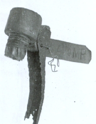 Fragment zapalnika od granatu zaczepnego lub obronnego (kopułka z łyżką) wz.31. Kopułka zapalnika o średnicy zewnętrznej 26 mm. Na kopułce wybity symbol: wz...31, Po drugiej stronie :4.
