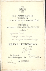 Dyplom nadania ppłk Władysławowi Muzyce Krzyża Legionowego |
