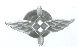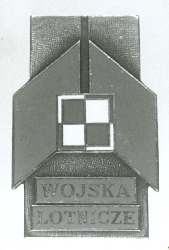 Korpusówka wojsk lotniczych dla personelu latającego, w wersji używanej po 1960r.Biało-czerwona, emaliowana szachownica lotnicza na tle ptasich skrzydeł i śmigła. W tylnej części gwintowany sztyft, na nim nakrętka z wytłoczonym napisem: Mennica Państwowa. |