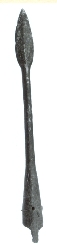 Stalowy grot włóczni, prawdopodobnie myśliwskiej. Liść niewielki 12,5 na 3,9cm, z wyraźnie zaznaczoną ością, połączony z tuleją długą, okrągłą w przekroju szyjką. Tuleja długości 11,8cm i średnicy u wylotu 3cm. Tuleja zakończona krótkim wąsem wzmacniającym osad...więcej Stalowy grot włóczni, prawdopodobnie myśliwskiej. Liść niewielki 12,5 na 3,9cm, z wyraźnie zaznaczoną ością, połączony z tuleją długą, okrągłą w przekroju szyjką. Tuleja długości 11,8cm i średnicy u wylotu 3cm. Tuleja zakończona krótkim wąsem wzmacniającym osadzenie na drzewcu. W odległości 3,7cm od wylotu, na płaszczyźnie górnej tulei znajduje się otwór na nit mocujący. |
