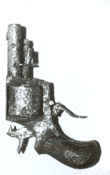 Rewolwer "Bulldog", kal. ok. 7 mm. Okładziny trzonu rękojeści bakelitowe zdobione ornamentem roślinnym.