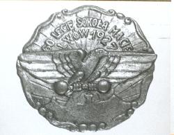 Odznaka pamiątkowa z okazji 60-lecia ZTG "Sokół". Na ozdobnej, kolistej tarczy, na pierwszym planie widoczny sokół z rozpostartymi skrzydłami, trzymający w szponach ciężarek gimnastyczny. Poniżej widoczny schematyczny zarys budowli Lwowa. W górnej części tarczy promienie i...więcej Odznaka pamiątkowa z okazji 60-lecia ZTG "Sokół". Na ozdobnej, kolistej tarczy, na pierwszym planie widoczny sokół z rozpostartymi skrzydłami, trzymający w szponach ciężarek gimnastyczny. Poniżej widoczny schematyczny zarys budowli Lwowa. W górnej części tarczy promienie i napis: