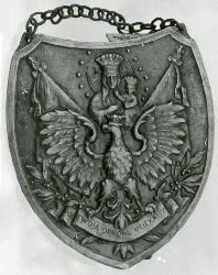 Ryngraf w kształcie tarczy z polskim orłem w koronie na tle Matki Boskiej Częstochowskiej i sztandarów. Pod orłem wstęga z napisem POD TWOJĄ OBRONĘ i ornament roślinny.Ryngraf zawieszony na łańcuchu. |