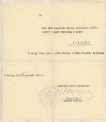 Nominacja ppłk. Władysława Muzyki, dowódcy baonu szkolnego piechoty w Zambrowie na dowódcę 7 Pułku Piechoty Legionów. Wystawiona w Warszawie 15 stycznia 1936r, podpisana przez Ministra Spraw Wojskowych, gen. dywizji Kasprzyckiego. Obok pieczęć okrągła z orłem w koronie i n...więcej Nominacja ppłk. Władysława Muzyki, dowódcy baonu szkolnego piechoty w Zambrowie na dowódcę 7 Pułku Piechoty Legionów. Wystawiona w Warszawie 15 stycznia 1936r, podpisana przez Ministra Spraw Wojskowych, gen. dywizji Kasprzyckiego. Obok pieczęć okrągła z orłem w koronie i napisem: Ministerstwo Spraw Wojskowych 5. |