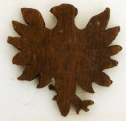 Drewniana kopia orzełka dywizji kościuszkowskiej. Wykonany z ciemnobrązowej sklejki. Z jednej strony matowy, z drugiej powierzchnia ciemniejsza, lekko błyszcząca. Każde skrzydło posiada 6 lotek. Jedna noga odłamana, brak symboli i sygnatur. |