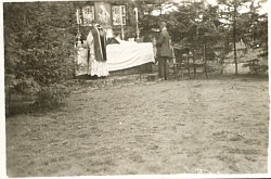 Fotografia w tonacji czarno białej przedstawiająca msze polową 7 PPLeg. odprawiana przez kapelana ks. Warchałowskiego. Na odwrocie adnotacja odręczna wykonana ołówkiem: "Msza polowa odprawia ks. Warchałowski." |