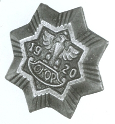 Odznaka Ochotniczego Korpusu Obrony Polski, wykonana z blachy mosiężnej w kształcie ośmioramiennej gwiazdy. W części centralnej umieszczony stylizowany orzeł w koronie na tarczy amazonek z literami OKOP. Po obu stronach orła data 1920. Z tyłu odznaki znajduje się gwintowany t...więcej Odznaka Ochotniczego Korpusu Obrony Polski, wykonana z blachy mosiężnej w kształcie ośmioramiennej gwiazdy. W części centralnej umieszczony stylizowany orzeł w koronie na tarczy amazonek z literami OKOP. Po obu stronach orła data 1920. Z tyłu odznaki znajduje się gwintowany trzpień mocujący. Brak nakrętki. |