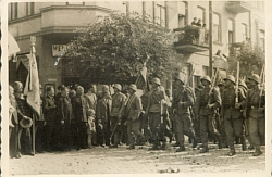 Fotografia w tonacji czarno-białej przedstawiająca powrót z manewrów. Na odwrocie adnotacja odręczna: "Powrót z manewrów". |