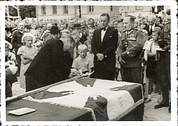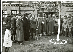 Fotografia w tonacji czarno-białej przedstawiająca uroczystość poświęcenia sztandaru Związku Ochotników Wojskowych oddział w Chełmie. Na odwrocie odręczna adnotacja atramentem: "Poświęcenie sztandaru Zw. O.W oddział w Chełmie dnia 2/VIII 1939 r." Niżej okrągła pieczę...więcej Fotografia w tonacji czarno-białej przedstawiająca uroczystość poświęcenia sztandaru Związku Ochotników Wojskowych oddział w Chełmie. Na odwrocie odręczna adnotacja atramentem: "Poświęcenie sztandaru Zw. O.W oddział w Chełmie dnia 2/VIII 1939 r." Niżej okrągła pieczęć z napisem: Związek Ochników Armii Polskiej Oddział Chełm Lubelski, wewnątrz wizerunek stylizowanego krzyża. |