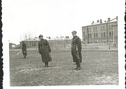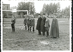 Fotografia w tonacji czarno białej przedstawiająca scenę przed przysięgą na placu koszarowym w Chełmie Lubelskim. Na odwrocie adnotacja: "Przed przysięga, od prawej: płk Jasieński dca II PAC płk Muzyka prezyd. Chełma Tomaszewski zginą na zamku w Lublinie starosta (nieczytel...więcej Fotografia w tonacji czarno białej przedstawiająca scenę przed przysięgą na placu koszarowym w Chełmie Lubelskim. Na odwrocie adnotacja: "Przed przysięga, od prawej: płk Jasieński dca II PAC płk Muzyka prezyd. Chełma Tomaszewski zginą na zamku w Lublinie starosta (nieczytelne)" Obok pieczęć zakładu fotograficznego. |