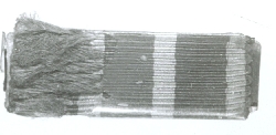 Baretka Medalu Wojska, barwy bordowej z czterema paskami białymi, rozmieszczonymi w równych odstępach. Baretka umieszczona na podkładce mosiężnej z zapinką, owinięta bezbarwną folią. Folia w połowie zniszczona, w tym miejscu wysnute nici z materiału, wypłowiałe. |