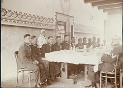 Fotografia w tonacji brązowej przedstawiająca obiad oficerski w kasynie w Chełmie Lubelskim. |