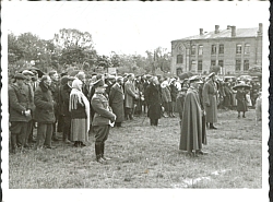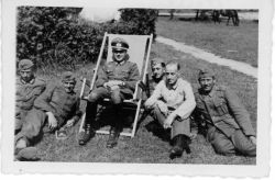 fotografia w tonacji czarno - białej o wymiarach 6x9 cm w odcieniu lekkiej sepii.Przedstawia oficera niemieckiego, siedzącego na leżaku (ogród, park?. Po obu jego stronach w pozycjach półleżących 4 żołnierzy w niemieckich mundurach i jeden mężczyzna w jasnej bluzie. Na odw...więcej fotografia w tonacji czarno - białej o wymiarach 6x9 cm w odcieniu lekkiej sepii.Przedstawia oficera niemieckiego, siedzącego na leżaku (ogród, park?. Po obu jego stronach w pozycjach półleżących 4 żołnierzy w niemieckich mundurach i jeden mężczyzna w jasnej bluzie. Na odwrocie fotografii odręczny podpis atramentem w języku niemieckim : "Im Juli 42." |