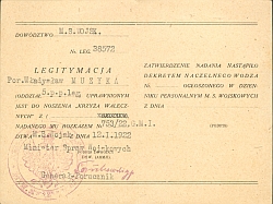 Legitymacja uprawniająca do noszenia Krzyża Walecznych nr 38572. Wystawiona na nazwisko por. Władysława Muzyki, rozkazem nr 753/22.G.M.I. u dniu 12.01.1922r. Opatrzona pieczęcią Ministerstwa Spraw Wojskowych i podpisem gen. Sosnkowskiego. |