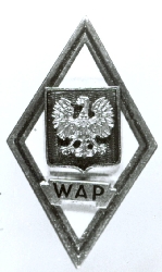 Odznaka pamiątkowa absolwenta Wojskowej Akademii Politycznej im. F. Dzierżyńskiego. Do odznaki wykonanej z aluminium przylutowane jest godło państwowe PRL (orzeł bez korony) oraz wstęga z napisem WAP. Całość obramowana tłoczoną ramka. Na odwrocie przylutowany trzpień z gwi...więcej Odznaka pamiątkowa absolwenta Wojskowej Akademii Politycznej im. F. Dzierżyńskiego. Do odznaki wykonanej z aluminium przylutowane jest godło państwowe PRL (orzeł bez korony) oraz wstęga z napisem WAP. Całość obramowana tłoczoną ramka. Na odwrocie przylutowany trzpień z gwintem do mocowania i zakrętka aluminiowa, oksydowana, z napisem Mennica Państwowa. |