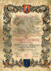 Akt nadania honorowego obywatelstwa miasta Zamościa 9 Pułkowi Piechoty Legionów. Spisany ręcznie na pergaminie, opatrzony pieczęcią miasta, oraz podpisami burmistrza i sekretarza. |