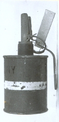 Granat zaczepny RG 42. Malowany na kolor khaki z białym poprzecznym pasem po środku.
