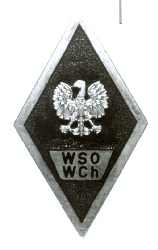 Pamiątkowa odznaka absolwenta Wyższej Szkoły Oficerskiej Wojsk Chemicznych. Na środku odznaki srebrny orzeł na czerwonym tle. Odznaka obramowana srebrną listwą. Poniżej orła na srebrnej wstędze WSOWCh. Odznaka w kształcie rombu, na odwrocie trzpień z gwintem oraz nakrętka. |