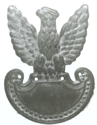 Orzeł do czapki, wytłoczony z aluminiowej blachy. Skrzydła o układzie wachlarzowatym, złożone z trzech warstw piór. Głowa zwrócona w prawo, bez korony. W szponach trzyma tarczę zdobioną 23 gwoździami na wstędze i dwoma wolutami z dalszymi pięcioma. Na rogach tarczy oraz n...więcej Orzeł do czapki, wytłoczony z aluminiowej blachy. Skrzydła o układzie wachlarzowatym, złożone z trzech warstw piór. Głowa zwrócona w prawo, bez korony. W szponach trzyma tarczę zdobioną 23 gwoździami na wstędze i dwoma wolutami z dalszymi pięcioma. Na rogach tarczy oraz na górnym szlaku cztery otwory do przymocowania orła. Orzeł bez sygnatur i napisów. |