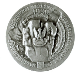 Medal pamiątkowy "Żołnierzom Września" wydany w 44 rocznicę walk pod Tomaszowem Lubelskim. Awers: w polu trójdzielnym przedstawieni żołnierze kawalerii, piechoty i artylerii. Na obrzeżu napis: WOJSKA FRONTU PÓŁNOCNEGO ARMIA KRAKÓW ARMIA LUBLIN. Rewers: centralnie umieszczon...więcej Medal pamiątkowy "Żołnierzom Września" wydany w 44 rocznicę walk pod Tomaszowem Lubelskim. Awers: w polu trójdzielnym przedstawieni żołnierze kawalerii, piechoty i artylerii. Na obrzeżu napis: WOJSKA FRONTU PÓŁNOCNEGO ARMIA KRAKÓW ARMIA LUBLIN. Rewers: centralnie umieszczony kontur mapy Polski z okresu międzywojennego i orłem wojskowym. Wokół napis: ŻOŁNIERZOM WRZEŚNIA SPOŁECZEŃSTWO TOMASZOWA LUBELSKIEGO.1939 17-20 IX 22-27IX. W 44 ROCZNICĘ BITWY Z NIEMCAMI POD TOMASZOWEM. |