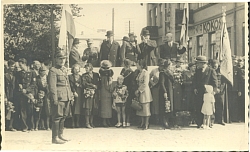 Fotografia w tonacji czarno białej przedstawiająca defiladę wojskową w Chełmie. Na trybunie widoczny płk Władysław Muzyka. |