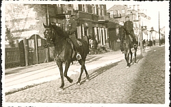 Fotografia w tonacji czarno-białej przedstawiająca płk Władysława Muzykę na przejażdżce konnej. Na odwrocie adnotacja odręczna: "przejażdżka z luzakiem" , obok pieczęć zakładu fotograficznego. |