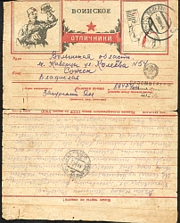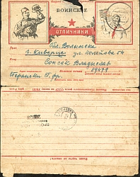 List do Kiwerc pisany na rosyjskim druku, datowany 14 VIII 44r. Adres, nazwisko adresata i nadawcy pisane odręcznie po rosyjsku, tekst wewnątrz po polsku. Przy nazwisku nadawcy nadawcy znajduje się numer poczty polowej 89479. Na górze blankietu widoczne rysunki propagandowe: żołn...więcej List do Kiwerc pisany na rosyjskim druku, datowany 14 VIII 44r. Adres, nazwisko adresata i nadawcy pisane odręcznie po rosyjsku, tekst wewnątrz po polsku. Przy nazwisku nadawcy nadawcy znajduje się numer poczty polowej 89479. Na górze blankietu widoczne rysunki propagandowe: żołnierz radziecki trzymający niemiecki hełm i pionier trzymający list, oraz hasło w języku rosyjskim "Śmierć niemieckim okupantom". |
