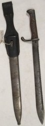 Bagnet do karabinu Mauser wz.1898/05 z pochwą stalową. Rękojeść stalowa z okładzinami z drewna, nacinanymi ukośnie, mocowanymi dwoma śrubami z nakrętkami. Na głowni pojedyncza bruzda, widać ślady po nieczytelnych sygnowaniach. Na grzbiecie głowni nacięte podwójnie zęby-...więcej Bagnet do karabinu Mauser wz.1898/05 z pochwą stalową. Rękojeść stalowa z okładzinami z drewna, nacinanymi ukośnie, mocowanymi dwoma śrubami z nakrętkami. Na głowni pojedyncza bruzda, widać ślady po nieczytelnych sygnowaniach. Na grzbiecie głowni nacięte podwójnie zęby-piły. Ostrze rozszerza się ku sztychowi. Pochwa stalowa z zaczepem do żabki, trzewik zakończony kulką. |
