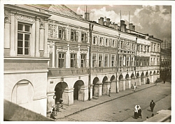 Pocztówka w tonacji szaro-brązowej przedstawiająca widok kamienic w rynku zamojskim. Na odwrocie adnotacja "Zamość. Kamienice w rynku. Fot. Prof. A.Lenkiewicza. 1253. Oryginalna fotografia." Niżej znak firmowy i napis: Książnica atlas. |