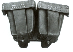 Ładownica skórzana, podwójna, polska. Złożona z dwóch pojemników z klapami. Do klap przymocowane są paski skóry z otworami do zapinania. W tylnej części przy każdym pojemniku znajduje się pasek skóry mocowany czterema nitami do zawieszenia ładownicy na pasie głównym. U...więcej Ładownica skórzana, podwójna, polska. Złożona z dwóch pojemników z klapami. Do klap przymocowane są paski skóry z otworami do zapinania. W tylnej części przy każdym pojemniku znajduje się pasek skóry mocowany czterema nitami do zawieszenia ładownicy na pasie głównym. U góry między pojemnikami znajduje się metalowy uchwyt. Na klapach po wewnętrznej stronie nieczytelne pieczecie. |