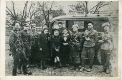 Czarno-biała fotografia przedstawiająca grupę partyzantów. Na odwrocie odręczna adnotacja: