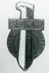 Złota odznaka Socjalistycznego Związku Młodzieży Wojskowej. Uproszczony kształt orła z biało-czerwonej emalii na tle koła otoczonego kłosami i kołem zębatym napis SZMP. Na odwrocie odznaki znajduje się gwintowany trzpień z nakrętką z napisem Mennica Państwowa. |