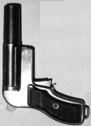 Pistolet sygnałowy konstrukcji radzieckiej, wyprodukowany na licencji w Polsce w 1952 roku. Lufa i korpus stalowe, oksydowane, okładziny rękojeści bakelitowe. Na lewej stronie korpusu wybite sygnatury: AP00163. Na grzbiecie komory nabojowej sygnatury: 11 w owalu (kod producenta) 19...więcej Pistolet sygnałowy konstrukcji radzieckiej, wyprodukowany na licencji w Polsce w 1952 roku. Lufa i korpus stalowe, oksydowane, okładziny rękojeści bakelitowe. Na lewej stronie korpusu wybite sygnatury: AP00163. Na grzbiecie komory nabojowej sygnatury: 11 w owalu (kod producenta) 1952 (rok produkcji) i AP00163 (nr broni). Pozbawiona cech bojowych przez usunięcie iglicy. Mechanizmy sprawne. Kal. 26,5mm. |