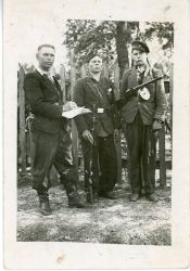 3) Iwan Tałach, zg...więcej Czarno-biała fotografia przedstawiająca trzech partyzantów: Griszę Bakajewa, Szpakowskiego i Iwana Tałacha. Na odwrocie oryginalna adnotacja w języku rosyjskim zostala zaklejona kartką z adnotacją polską: