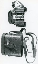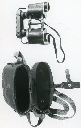 Lornetka wojskowa 8x30 w futerale. Oprawa metalowa malowana na czarno. Miejscowe ubytki farby. Oprawa okularów bakelitowa, przy lewym okularze wyszczerbiona. Na obudowie lewego okularu wybity numer L-7752 i data 1959, na prawym w elipsie numer 131, poniżej 8x30. Wspornik łączący o...więcej Lornetka wojskowa 8x30 w futerale. Oprawa metalowa malowana na czarno. Miejscowe ubytki farby. Oprawa okularów bakelitowa, przy lewym okularze wyszczerbiona. Na obudowie lewego okularu wybity numer L-7752 i data 1959, na prawym w elipsie numer 131, poniżej 8x30. Wspornik łączący okulary mosiężny. Na obudowie po obu stronach zaczepy do mocowania skórzanego pasa nośnego. Osłona okularów skórzana w kształcie elipsy. Całość umieszczona w futerale skórzanym wyłożonym flanelą, z metalowym zaczepem do zamykania futerału. Pas nośny futerału brezentowy. |